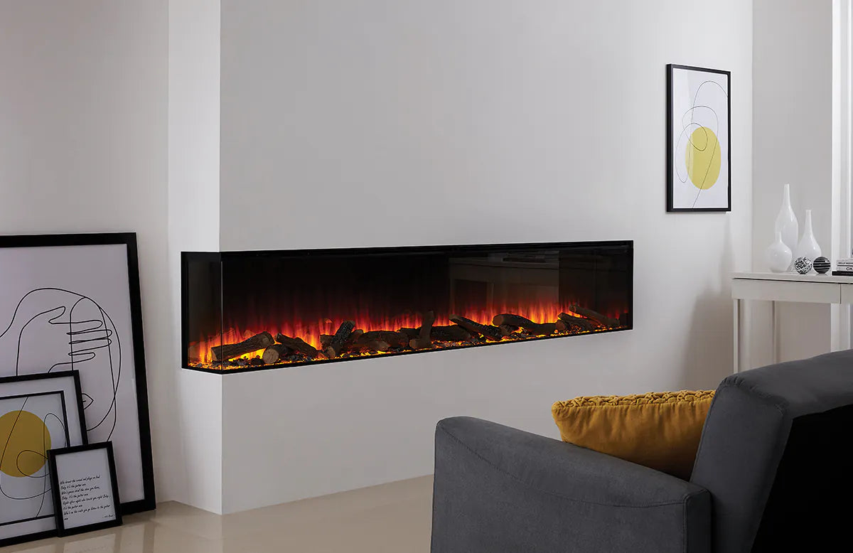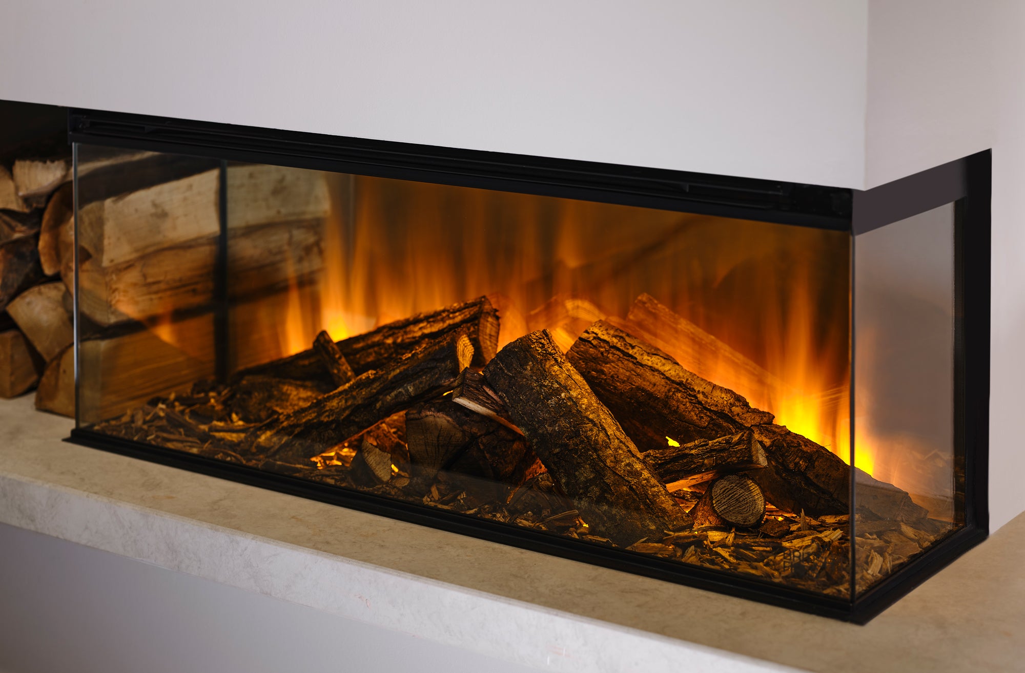 A three-sided install offers both the left and right hand sides open within a constructed chimney breast. We have shown the fire . This design offers a modern approach on a classic arrangement.