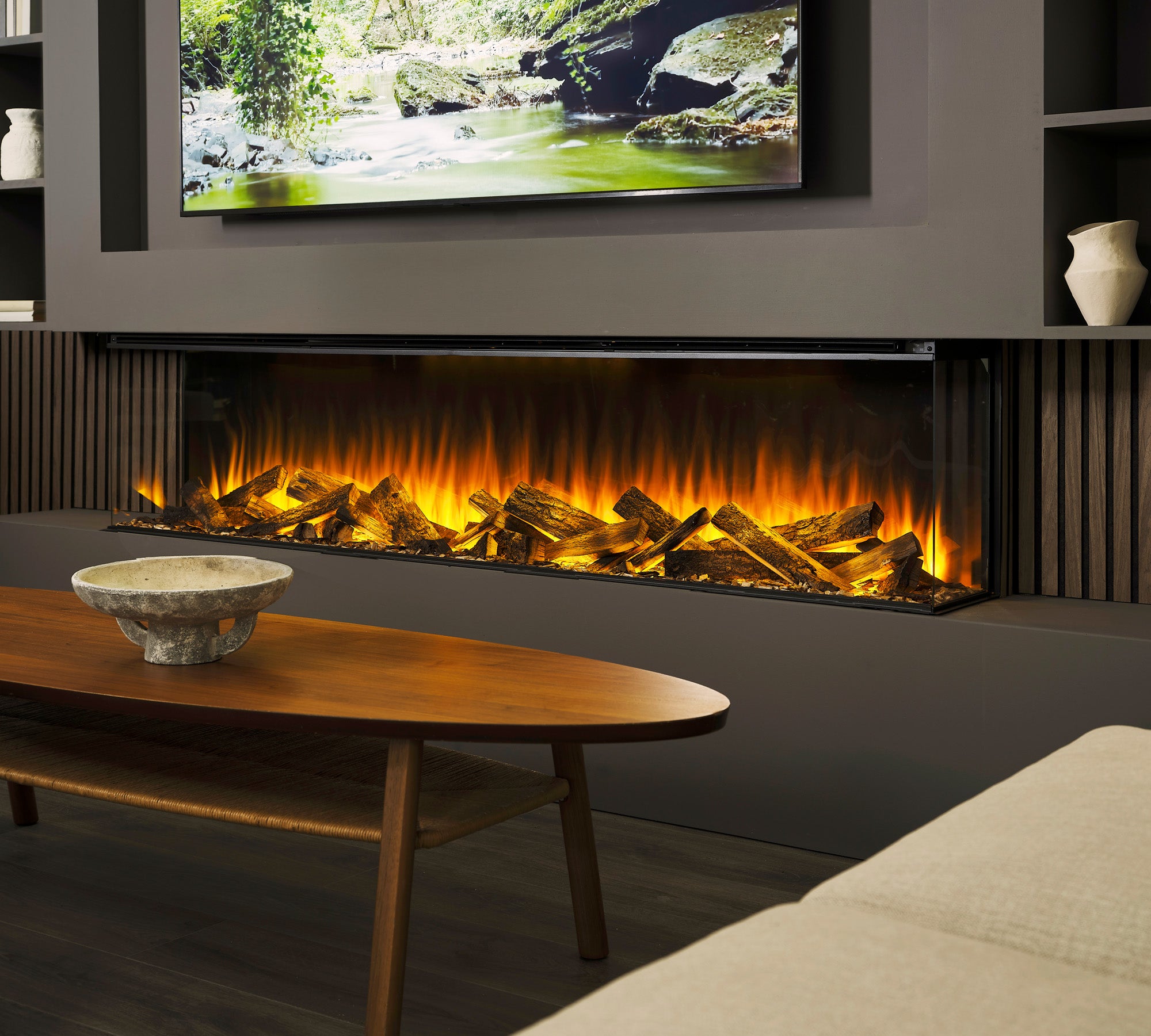 Fully Recessed creates a more prominent face-on view both sides can be covered by fully-recessing the fire into the chimney breast. This installation method adds perceived width to any room.